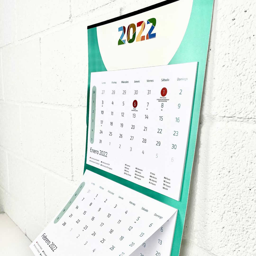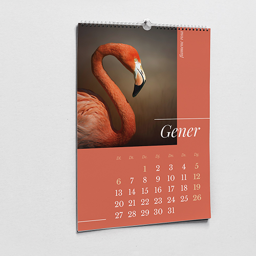 Calendaris que estan compostos d’una part superior 100% personalitzable en disseny de 47×30 cm i que resta visible tot l’any. I per l’altra d’una faldilla estàndard de la qual s’arrenquen els fulls en finalitzar cada mes.