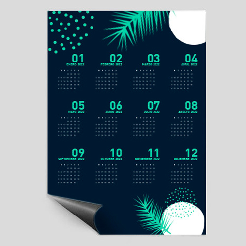 Pensats perquè tot l’any quedi visible en un sol full. És un calendari molt versàtil, ideal per penjar-lo fàcilment a qualsevol espai. Les mides estàndard són A4 i A3, però el podem imprimir en qualsevol mida.