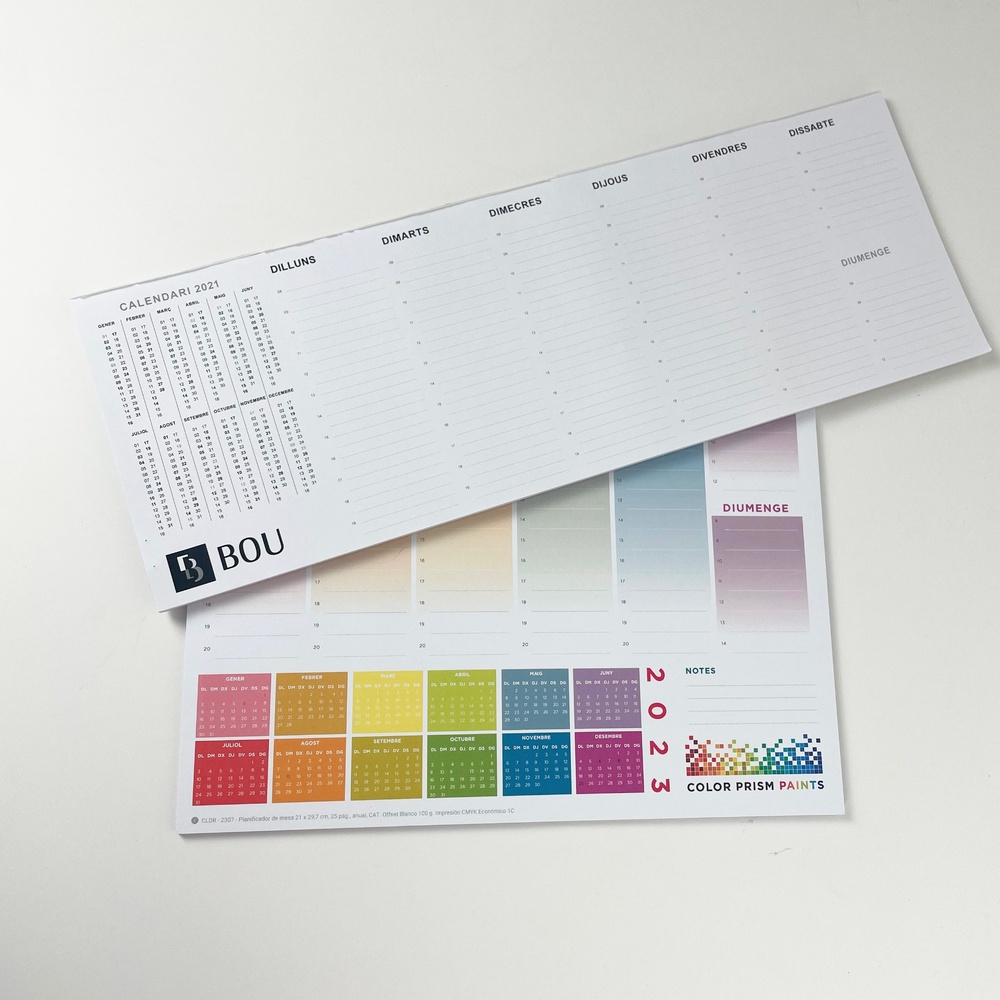 Imprimim diversos tipus de calendaris, planificadors i agendes personalitzades. A més, ens encarreguem de tot el procés, des del disseny fins a la impressió, amb opcions de personalització total i tirades des d’una unitat fins a milers.